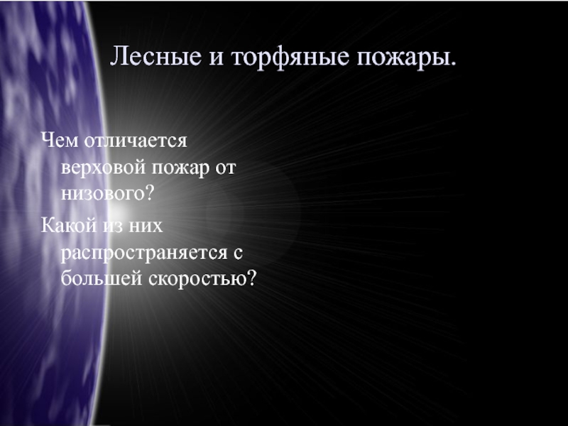 Лесные и торфяные пожары.Чем отличается верховой пожар от низового?Какой из них распространяется с большей скоростью?