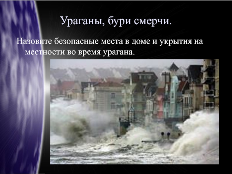 Ураганы, бури смерчи.Назовите безопасные места в доме и укрытия на местности во время урагана.