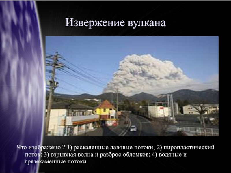 Извержение вулканаЧто изображено ? 1) раскаленные лавовые потоки; 2) пиропластический поток; 3) взрывная волна и разброс обломков;