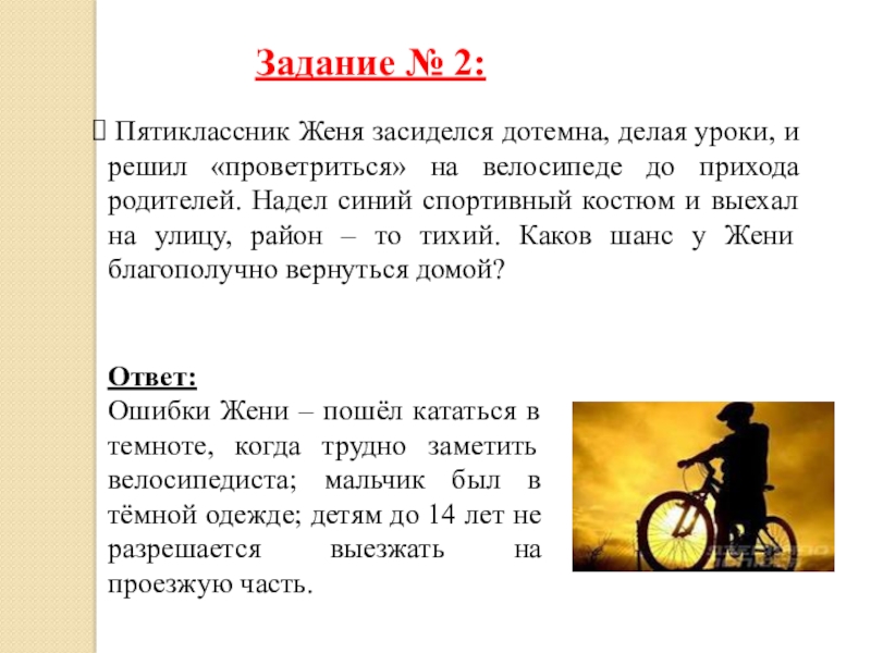 Ошибки Жени – пошёл кататься в темноте, когда трудно заметить велосипедиста; мальчик был в тёмной одежде; детям до 14 лет не разрешается выезжать на проезжую часть.