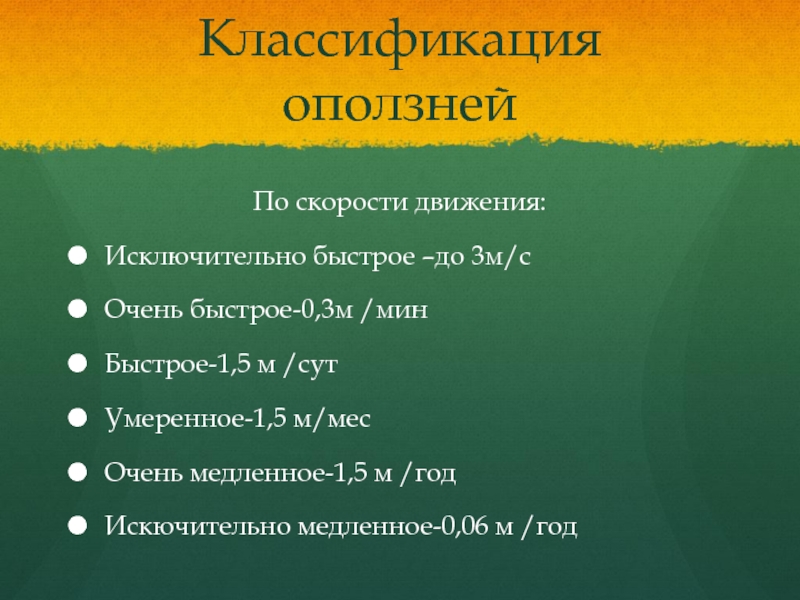 силы тяжести. Оползни возникают на склонах при нарушении устойчивости грунта или горных пород склона. Силы трения, обеспечивающие сцепление грунтов или горных пород на склонах, оказываются меньше силы тяжести, и вся масса грунта (горной породы) приходит в движение.