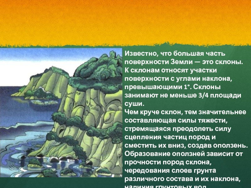 Чем круче склон, тем значительнее составляющая силы тяжести, стремящаяся преодолеть силу сцепления частиц пород и сместить их вниз, создав оползень.