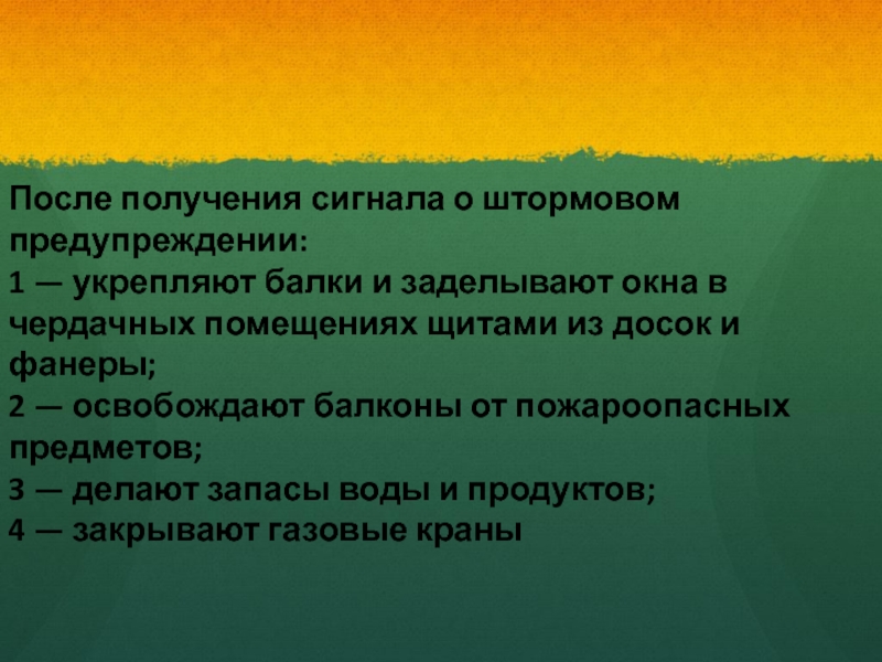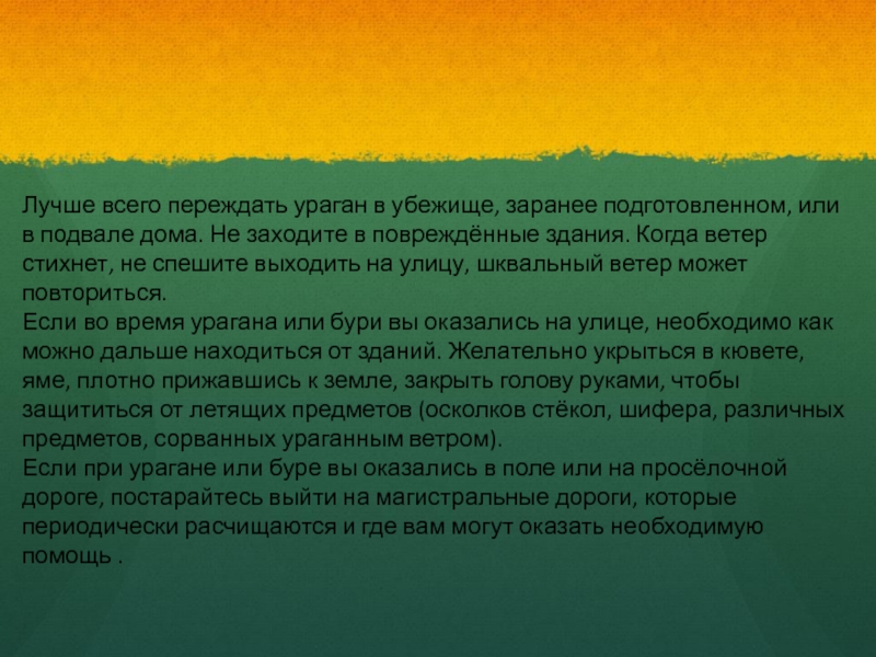 подготовленном, или в подвале дома. Не заходите в повреждённые здания. Когда ветер стихнет, не спешите выходить на улицу, шквальный ветер может повториться.