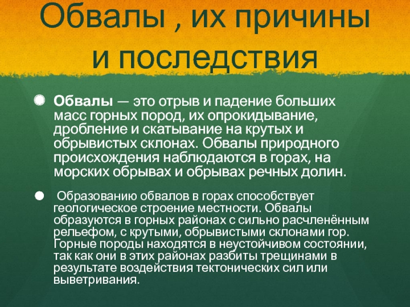Образованию обвалов в горах способствует геологическое строение местности. Обвалы образуются в горных районах с сильно расчленённым рельефом, с крутыми, обрывистыми склонами гор. Горные породы находятся в неустойчивом состоянии, так как они в этих районах разбиты трещинами в результате воздействия тектонических сил или выветривания.