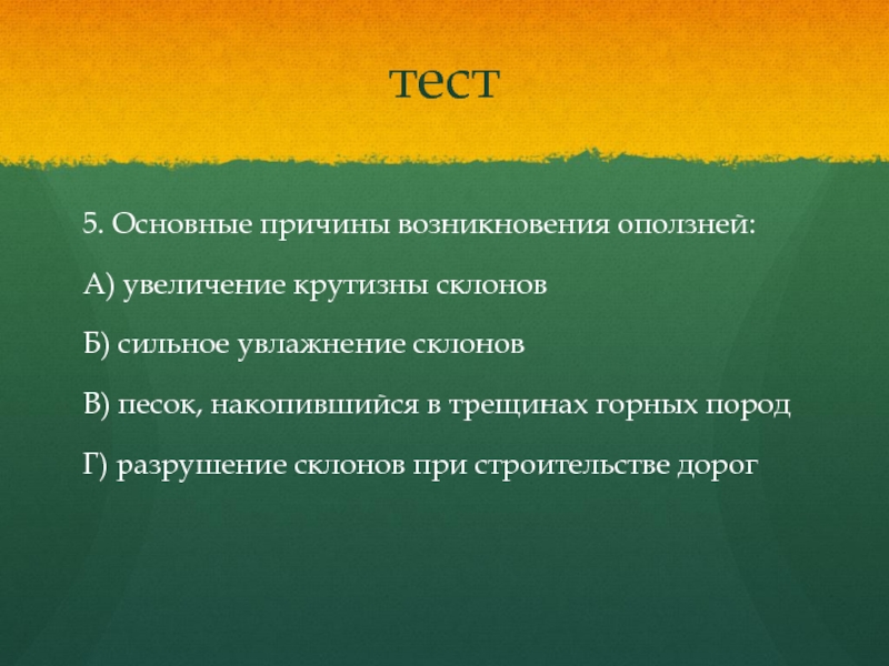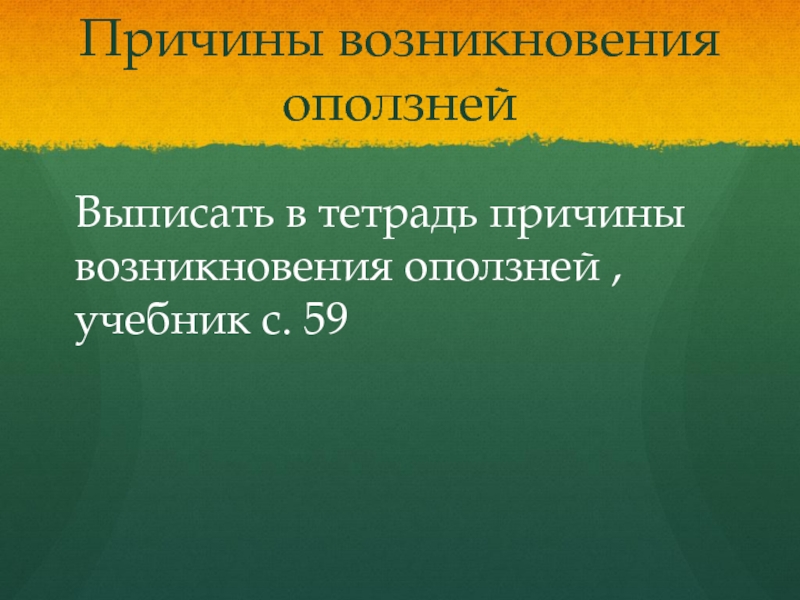 Выписать в тетрадь причины возникновения оползней , учебник с.