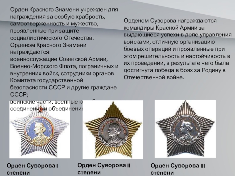 Орденом Суворова награждаются командиры Красной Армии за выдающиеся успехи в деле управления войсками, отличную организацию боевых операций и проявленные при этом решительность и настойчивость в их проведении, в результате чего была достигнута победа в боях за Родину в Отечественной войне.