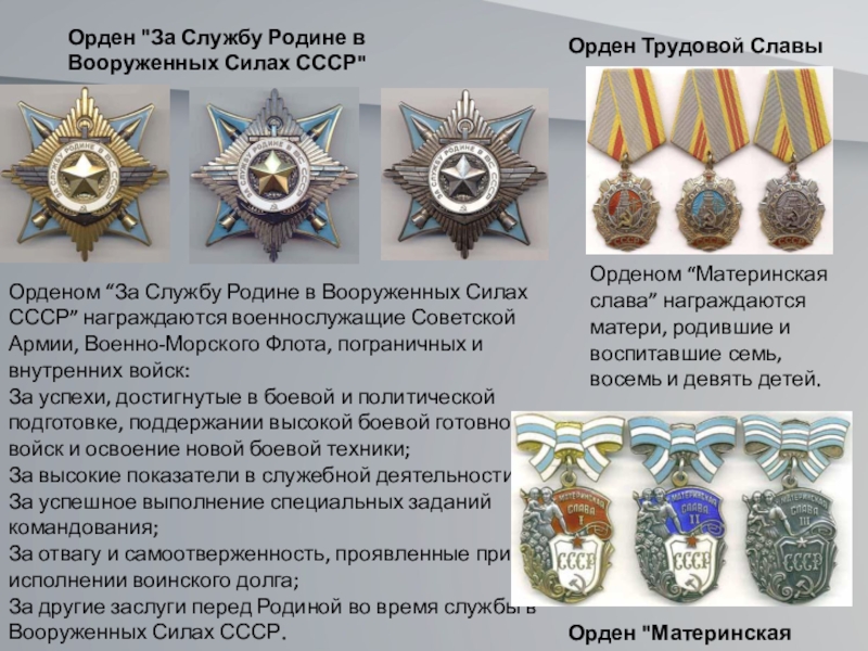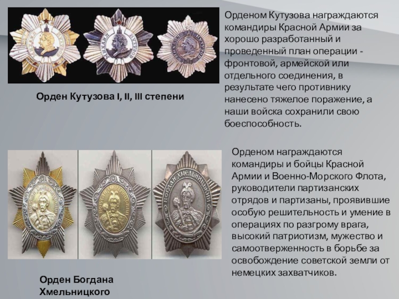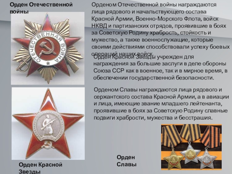 Орденом Славы награждаются лица рядового и сержантского состава Красной Армии, а в авиации и лица, имеющие звание младшего лейтенанта, проявившие в боях за Советскую Родину славные подвиги храбрости, мужества и бесстрашия.
