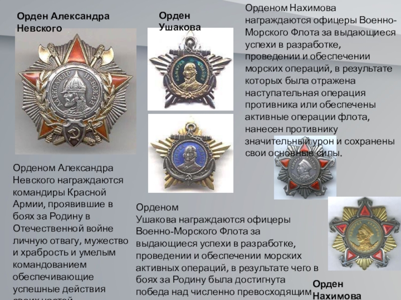 Орденом Нахимова награждаются офицеры Военно-Морского Флота за выдающиеся успехи в разработке, проведении и обеспечении морских операций, в результате которых была отражена наступательная операция противника или обеспечены активные операции флота, нанесен противнику значительный урон и сохранены свои основные силы.