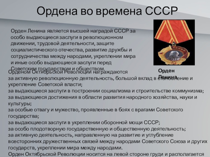 Орден Октябрьской Революции носится на левой стороне груди и располагается после ордена Ленина.