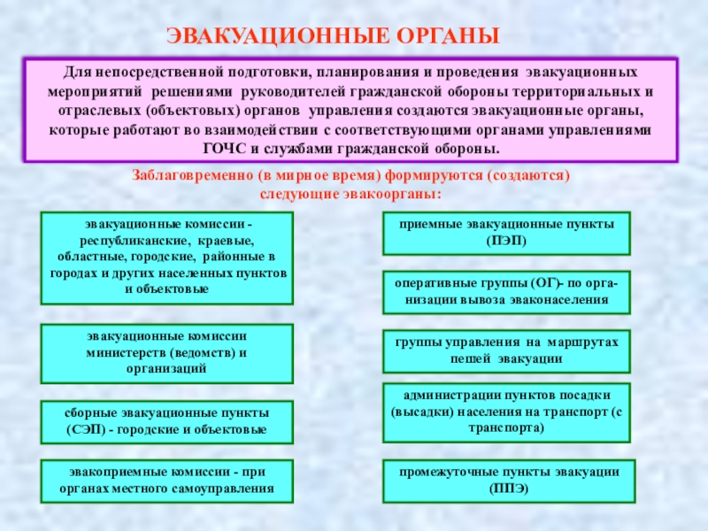 Заблаговременно (в мирное время) формируются (создаются) следующие эвакоорганы: