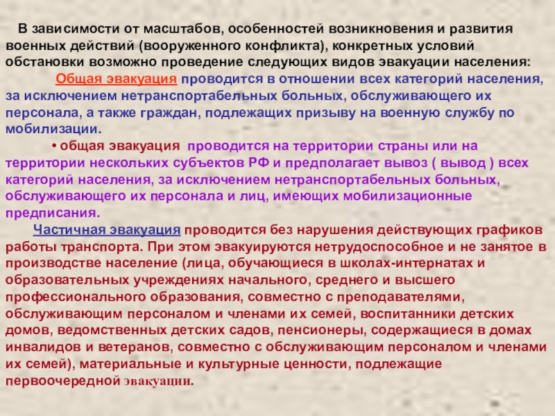 Эвакуационные мероприятия осуществляются по решению Президента Российской Федерации или руководителя гражданской обороны Российской Федерации - Председателя Правительства Российской Федерации и в отдельных случаях, требующих принятия немедленного решения, по решению Начальников гражданской обороны субъектов Российской Федерации с последующим докладом по подчиненности.