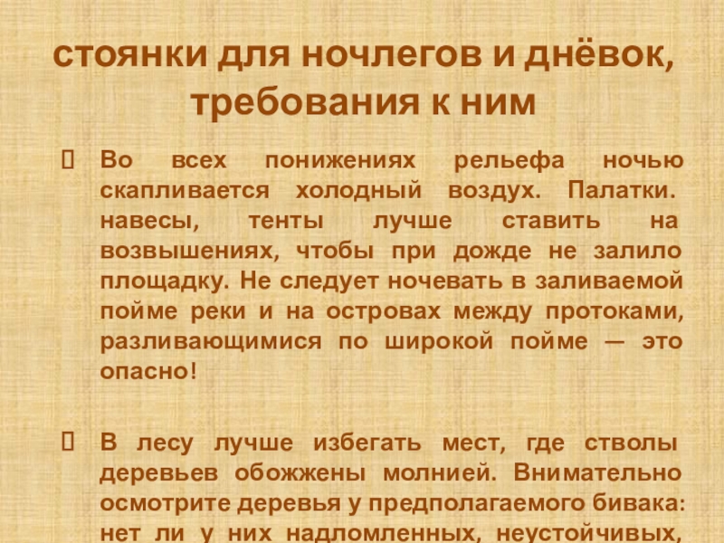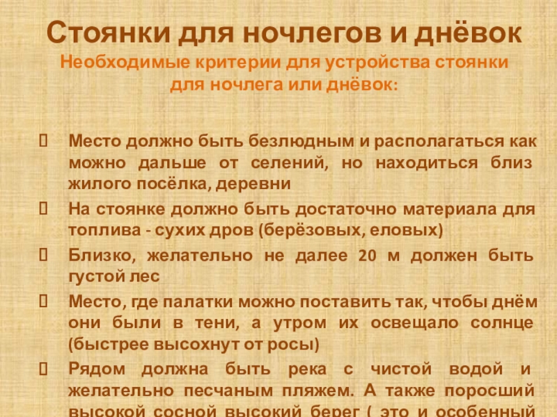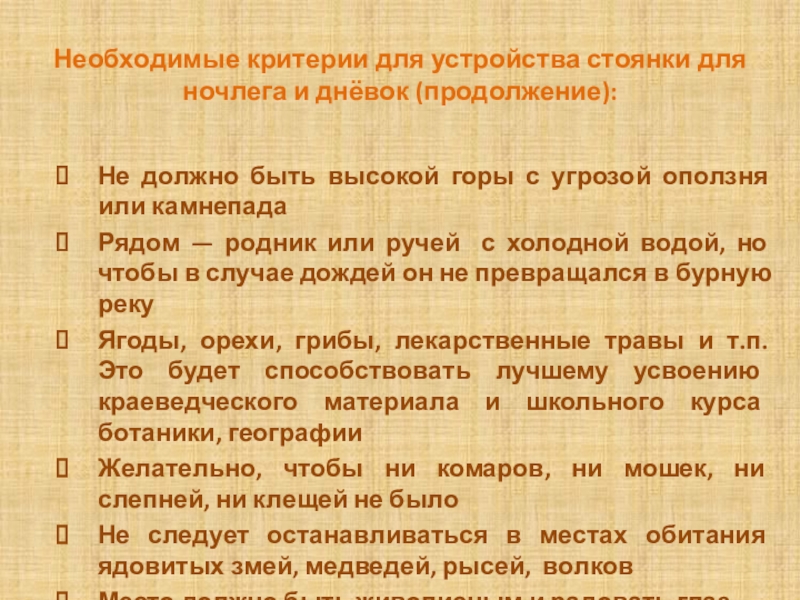 Слайд 11Необходимые критерии для устройства стоянки для ночлега и днёвок (продолжение):