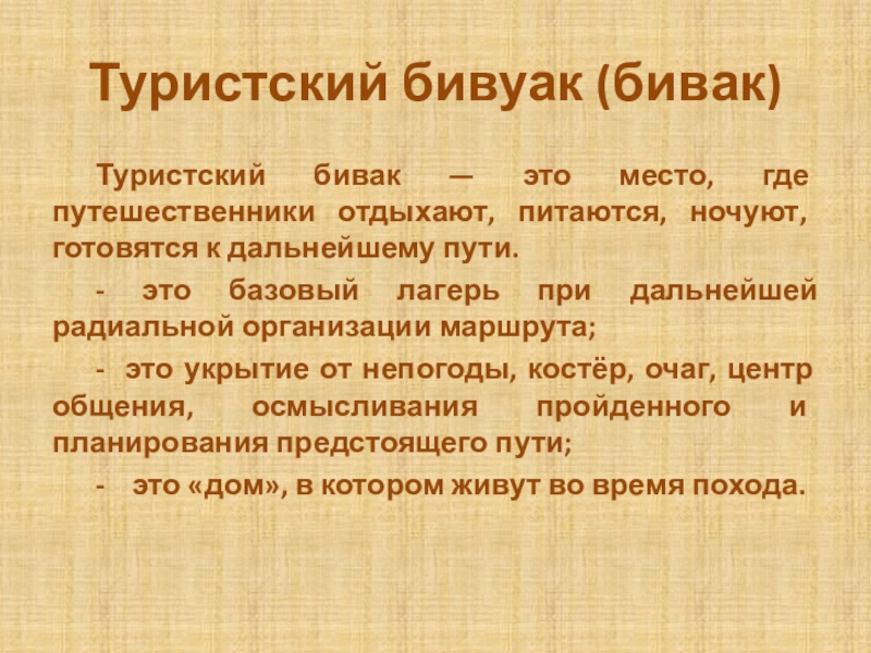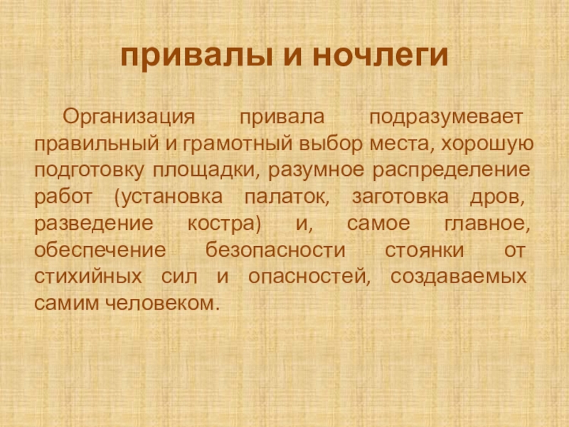 подготовку площадки, разумное распределение работ (установка палаток, заготовка дров, разведение костра) и, самое главное, обеспечение безопасности стоянки от стихийных сил и опасностей, создаваемых самим человеком.