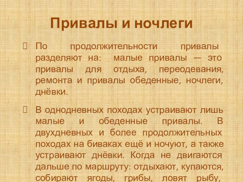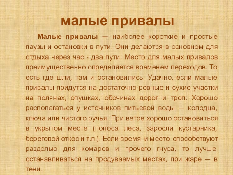 в пути. Они делаются в основном для отдыха через час - два пути. Место для малых привалов преимущественно определяется временем переходов. То есть где шли, там и остановились. Удачно, если малые привалы придутся на достаточно ровные и сухие участки на полянах, опушках, обочинах дорог и троп. Хорошо располагаться у источников питьевой воды — колодца, ключа или чистого ручья. При ветре хорошо остановиться в укрытом месте (полоса леса, заросли кустарника, береговой откос и т.п.). Если время и место способствуют раздолью для комаров и прочего гнуса, то лучше останавливаться на продуваемых местах, при жаре — в тени.