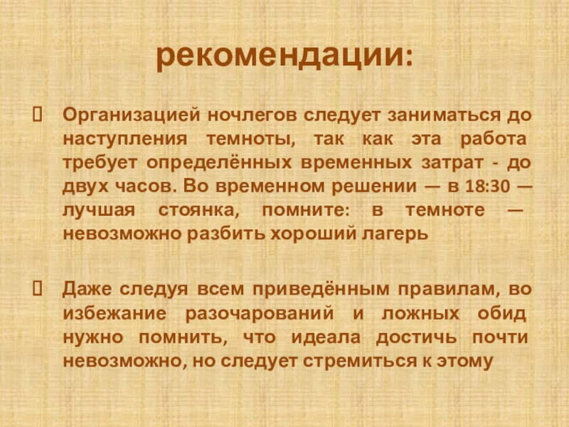 Организацией ночлегов следует заниматься до наступления темноты, так как эта работа
