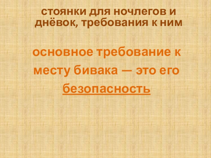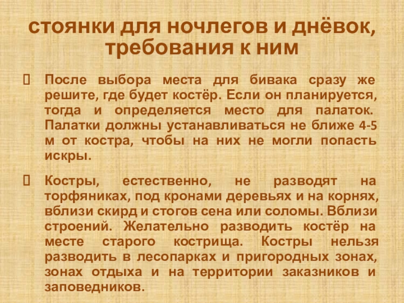 Слайд 13стоянки для ночлегов и днёвок, требования к ним