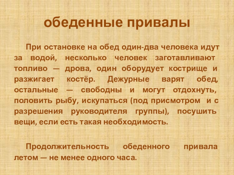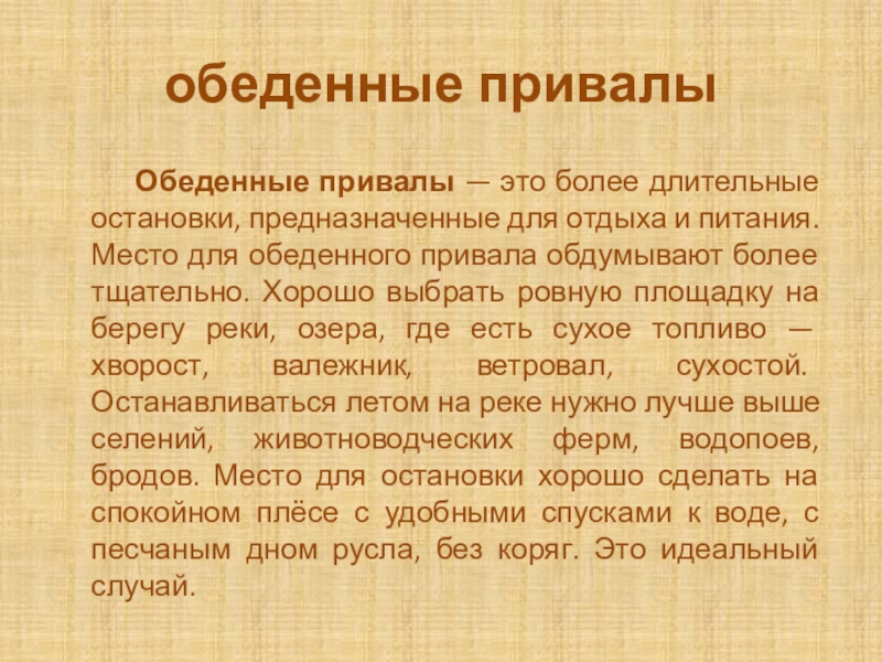 и питания. Место для обеденного привала обдумывают более тщательно. Хорошо выбрать ровную площадку на берегу реки, озера, где есть сухое топливо — хворост, валежник, ветровал, сухостой. Останавливаться летом на реке нужно лучше выше селений, животноводческих ферм, водопоев, бродов. Место для остановки хорошо сделать на спокойном плёсе с удобными спусками к воде, с песчаным дном русла, без коряг. Это идеальный случай.