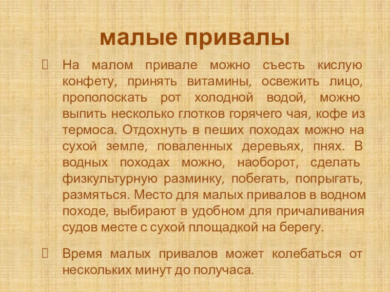 лицо, прополоскать рот холодной водой, можно выпить несколько глотков горячего чая, кофе из термоса. Отдохнуть в пеших походах можно на сухой земле, поваленных деревьях, пнях. В водных походах можно, наоборот, сделать физкультурную разминку, побегать, попрыгать, размяться. Место для малых привалов в водном походе, выбирают в удобном для причаливания судов месте с сухой площадкой на берегу.