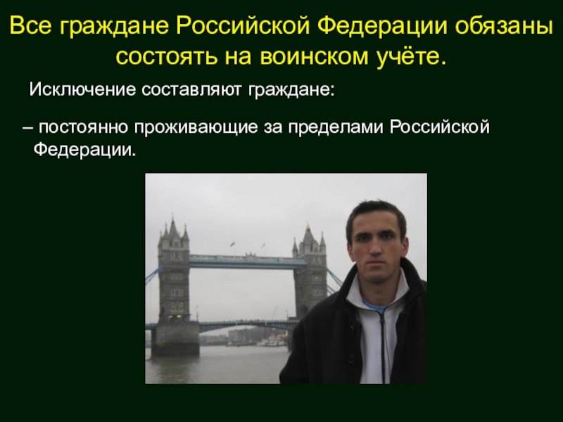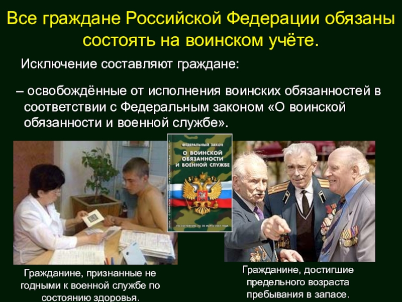 Слайд 7Все граждане Российской Федерации обязаны состоять на воинском учёте.
