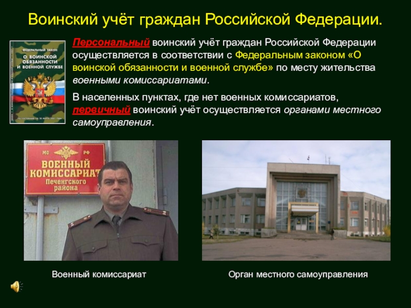 Воинский учёт граждан Российской Федерации.Персональный воинский учёт граждан Российской Федерации осуществляется в соответствии с Федеральным законом «О