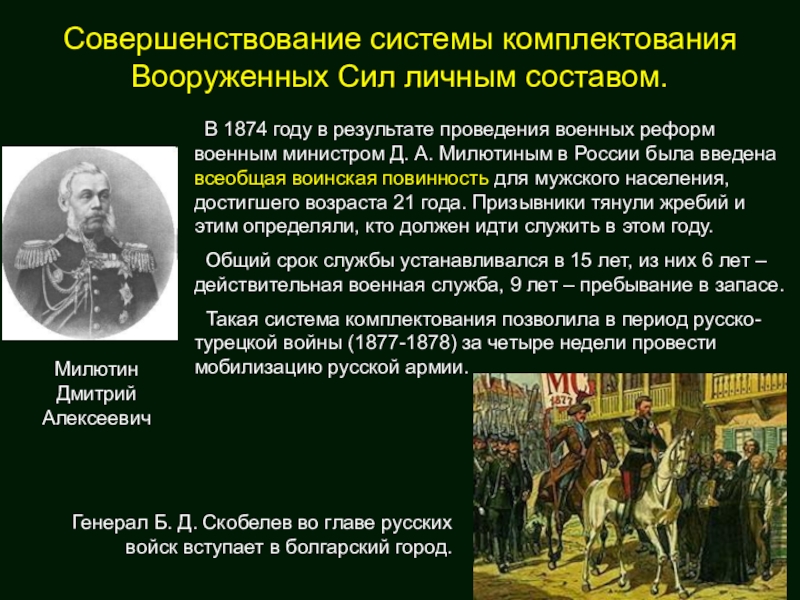 Совершенствование системы комплектования Вооруженных Сил личным составом. В 1874 году в результате проведения военных реформ военным министром