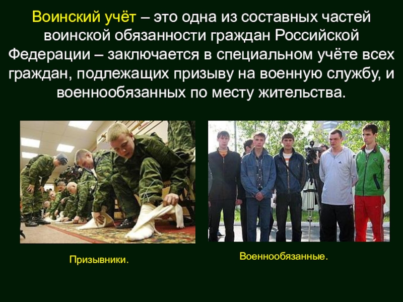 Воинский учёт – это одна из составных частей воинской обязанности граждан Российской Федерации – заключается в специальном учёте всех граждан, подлежащих призыву на военную службу, и военнообязанных по месту жительства.Призывники.Военнообязанные.