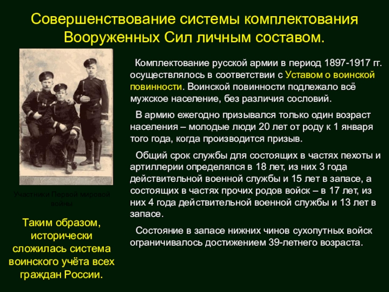 Совершенствование системы комплектования Вооруженных Сил личным составом. Комплектование русской армии в период 1897-1917 гг. осуществлялось в соответствии