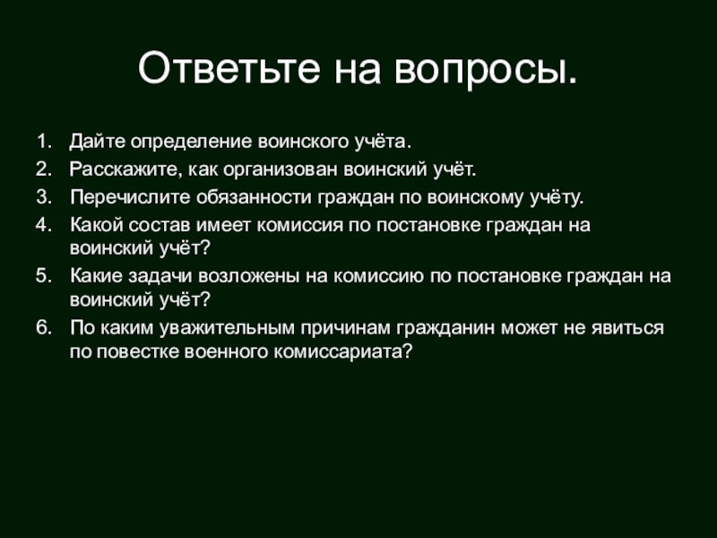 Ответьте на вопросы.Дайте определение воинского учёта.Расскажите, как организован воинский учёт.Перечислите обязанности граждан по воинскому учёту.Какой состав имеет