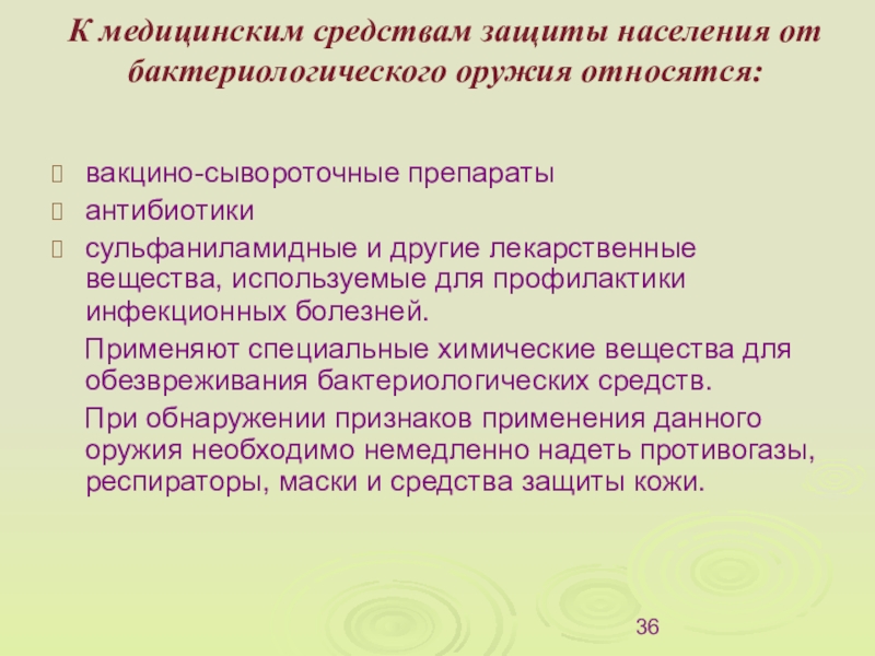 Слайд 36К медицинским средствам защиты населения от бактериологического оружия относятся: