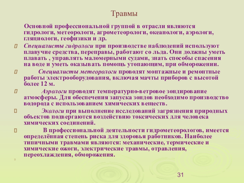 В профессиональной деятельности гидрометеорологов, имеется определённая степень риска для здоровья работников. Наиболее типичными травмами являются: механические, термические и химические ожоги, электрические травмы, отравления, переохлаждения, обморожения.
