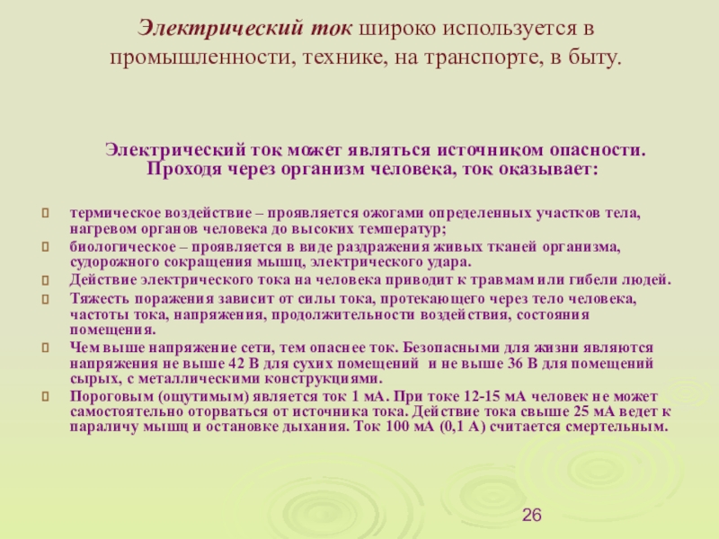 Электрический ток может являться источником опасности. Проходя через организм человека, ток оказывает: