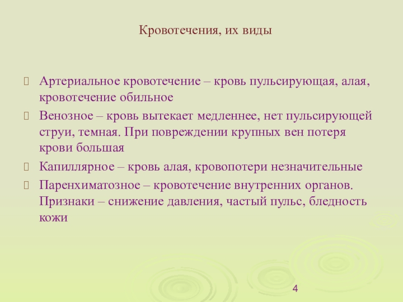 Паренхиматозное – кровотечение внутренних органов. Признаки – снижение давления, частый пульс, бледность кожи