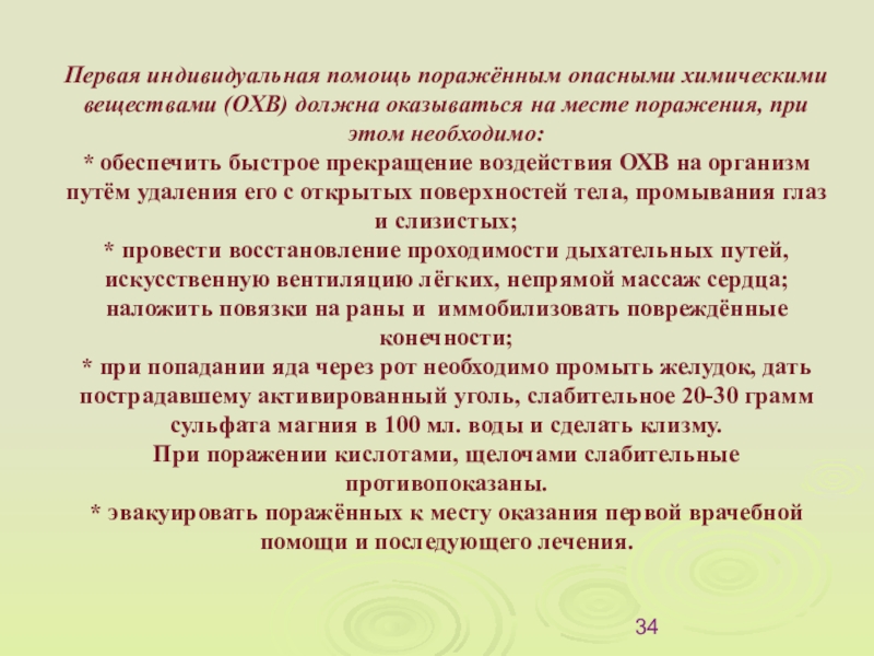 Слайд 34Первая индивидуальная помощь поражённым опасными химическими веществами (ОХВ) должна оказываться на