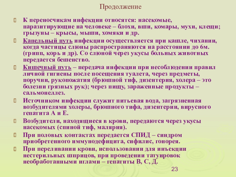 Кишечный путь – передача инфекции при несоблюдении правил личной гигиены после посещения туалета, через предметы, поручни, рукопожатия (брюшной тиф, дизентерия, холера – это болезни грязных рук); через пищу, зараженные продукты – сальмонеллез.
