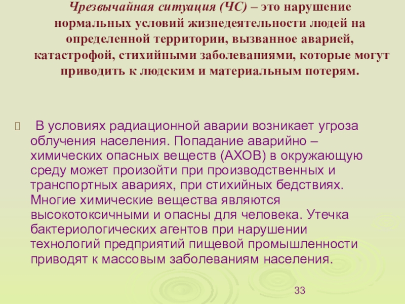 Слайд 33Чрезвычайная ситуация (ЧС) – это нарушение нормальных условий жизнедеятельности людей на
