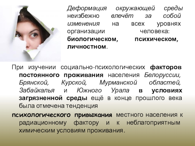 При изучении социально-психологических факторов постоянного проживания населения Белоруссии, Брянской, Курской, Мурманской областей, Забайкалья и Южного Урала в условиях загрязненной среды ещё в конце прошлого века была отмечена тенденция
