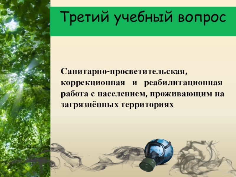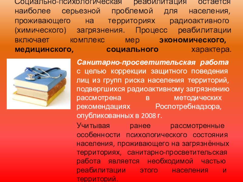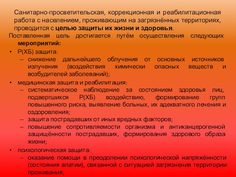 Слайд 46Санитарно-просветительская, коррекционная и реабилитационная работа с населением, проживающим на загрязнённых территориях,