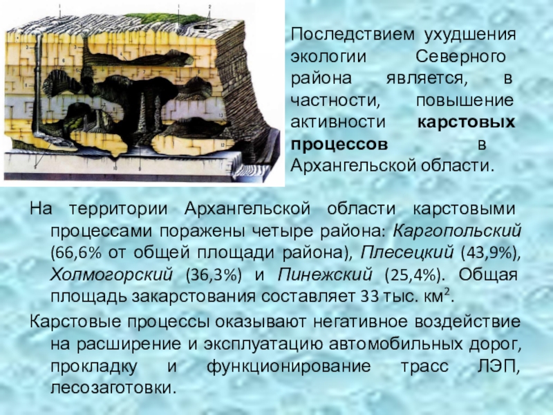 На территории Архангельской области карстовыми процессами поражены четыре района: Каргопольский (66,6% от общей площади района), Плесецкий (43,9%), Холмогорский (36,3%) и Пинежский (25,4%). Общая площадь закарстования составляет 33 тыс. км2.