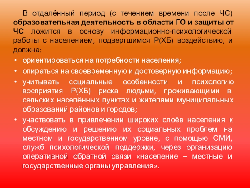 области ГО и защиты от ЧС ложится в основу информационно-психологической работы с населением, подвергшимся Р(ХБ) воздействию, и должна: