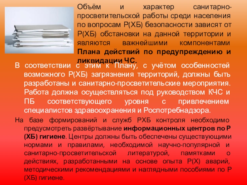В соответствии с этим к Плану, с учётом особенностей возможного Р(ХБ) загрязнения территорий, должны быть разработаны и санитарно-просветительские мероприятия. Работа должна осуществляться под руководством КЧС и ПБ соответствующего уровня с привлечением специалистов здравоохранения и Роспотребнадзора.
