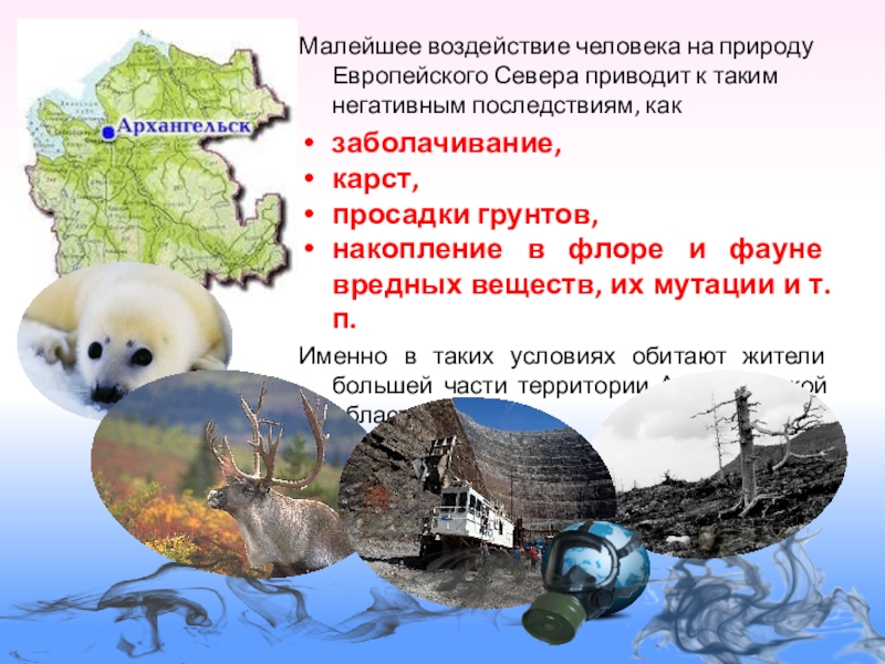 Слайд 12Малейшее воздействие человека на природу Европейского Севера приводит к таким негативным