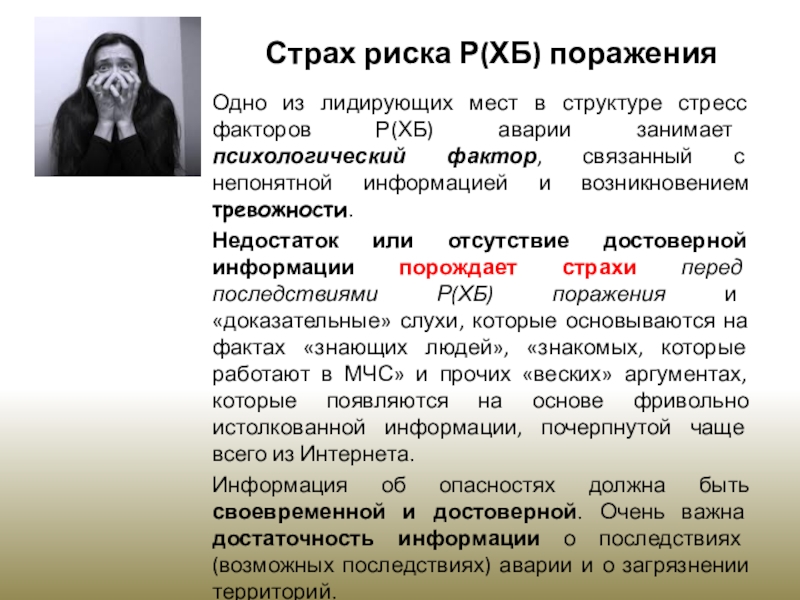 Недостаток или отсутствие достоверной информации порождает страхи перед последствиями Р(ХБ) поражения и «доказательные» слухи, которые основываются на фактах «знающих людей», «знакомых, которые работают в МЧС» и прочих «веских» аргументах, которые появляются на основе фривольно истолкованной информации, почерпнутой чаще всего из Интернета.