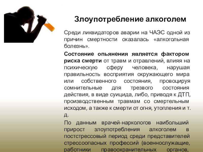 По данным врачей-наркологов наибольший прирост злоупотребления алкоголем в постстрессовый период среди представителей стрессоопасных профессий (военнослужащие, работники правоохранительных органов, спасатели, пожарные и т.п.) приходится на Северо-западный регион (112,9 % в год).