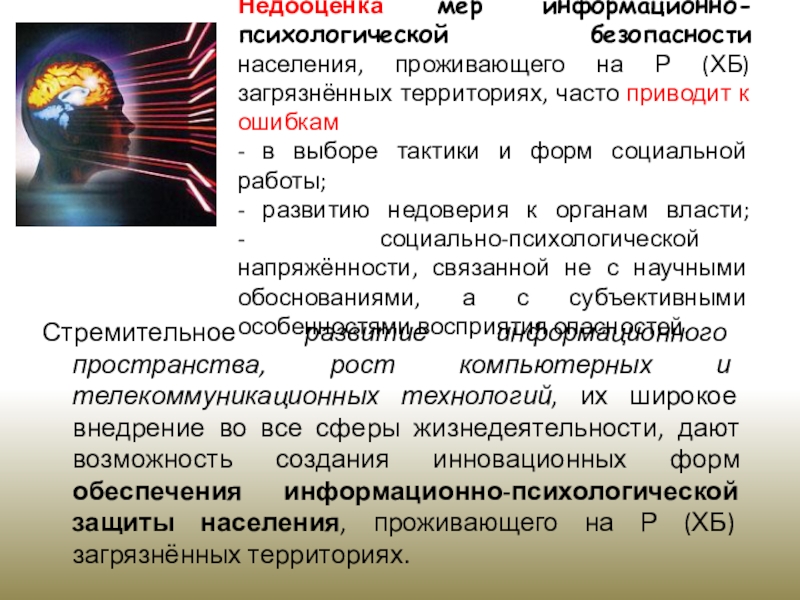 Слайд 41Недооценка мер информационно-психологической безопасности населения, проживающего на Р (ХБ) загрязнённых территориях,