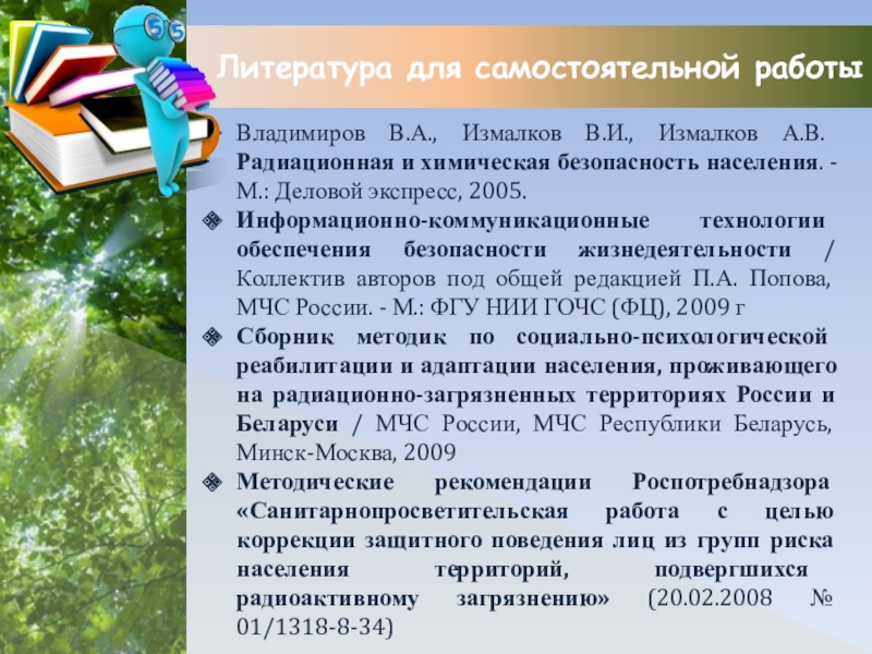 Санитарно-просветительская работа с целью коррекции защитного поведения лиц из групп риска населения территорий, подвергшихся радиоактивному загрязнению рассмотрена в методических рекомендациях Роспотребнадзора, опубликованных в 2008 г.