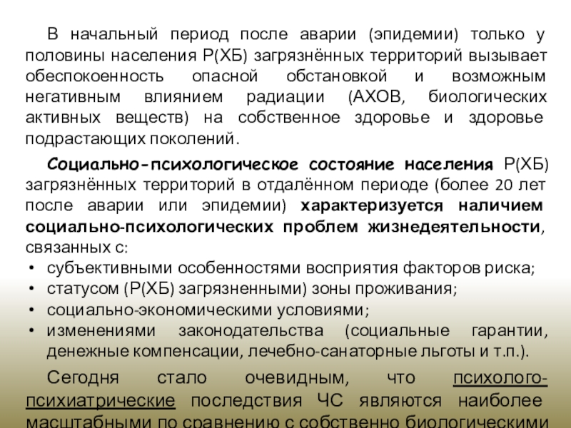 Социально-психологическое состояние населения Р(ХБ) загрязнённых территорий в отдалённом периоде (более 20 лет после аварии или эпидемии) характеризуется наличием социально-психологических проблем жизнедеятельности, связанных с:
