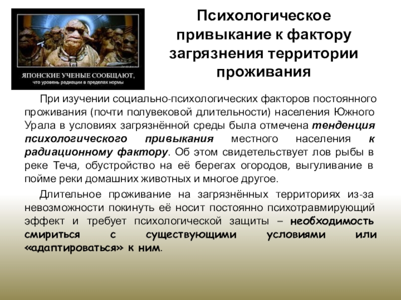 психологического привыкания местного населения к радиационному фактору и к неблагоприятным химическим условиям проживания.