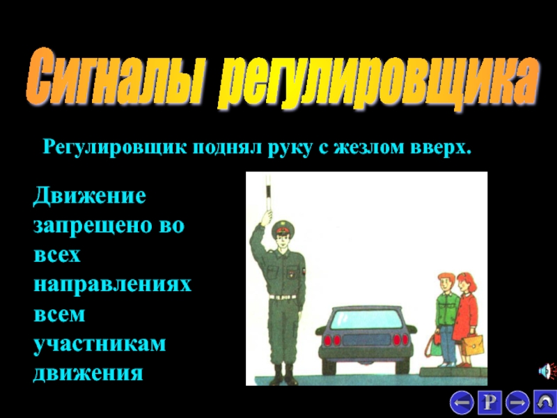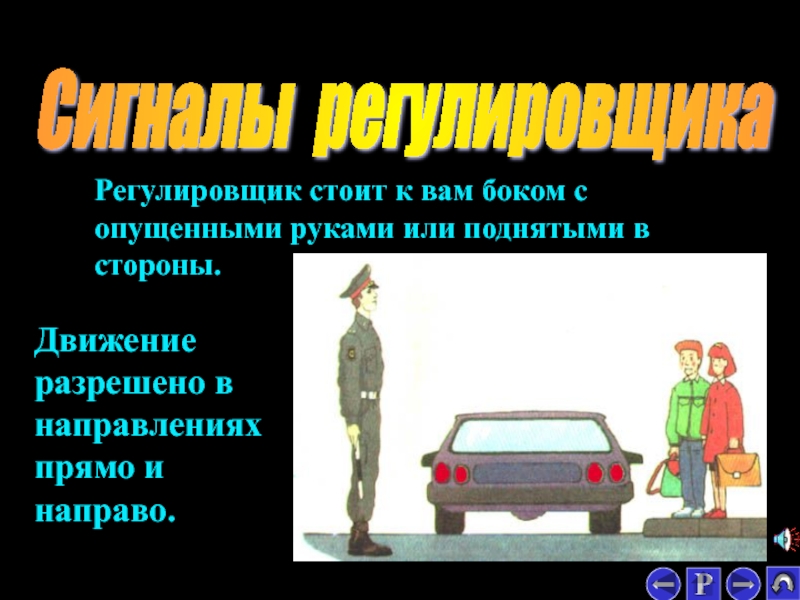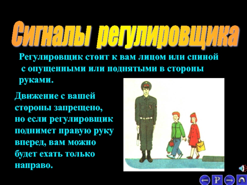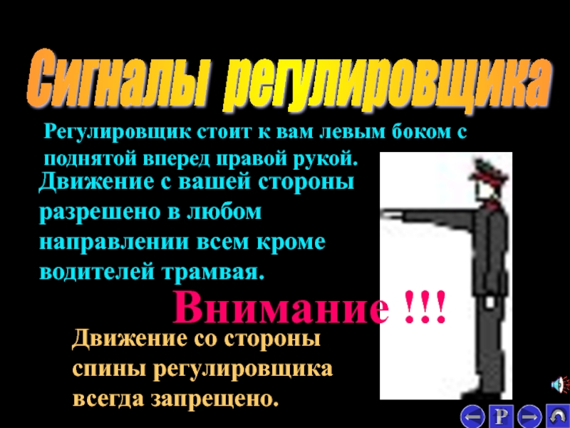 Регулировщик стоит к вам левым боком с поднятой вперед правой рукой.