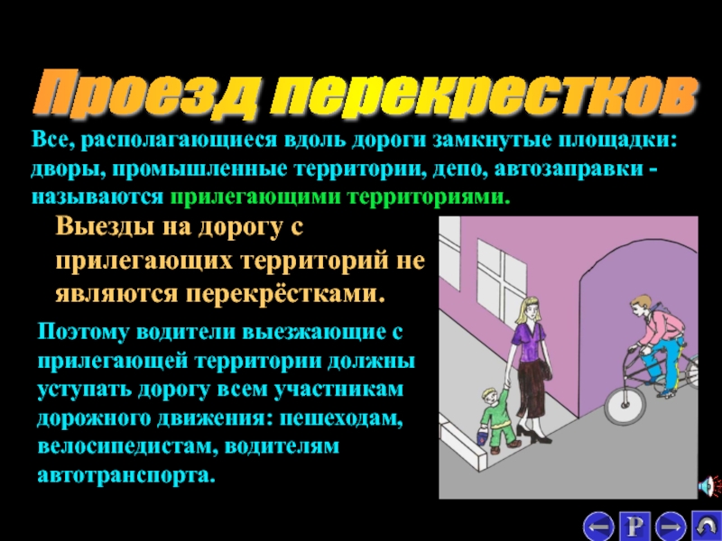 Поэтому водители выезжающие с прилегающей территории должны уступать дорогу всем участникам дорожного движения: пешеходам, велосипедистам, водителям автотранспорта.