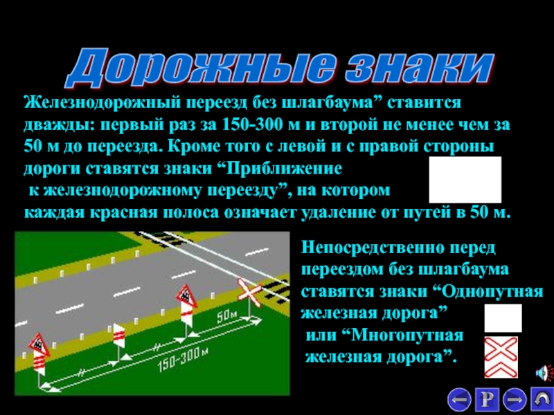 Железнодорожный переезд без шлагбаума” ставится дважды: первый раз за 150-300 м и второй не менее чем за 50 м до переезда. Кроме того с левой и с правой стороны дороги ставятся знаки “Приближение